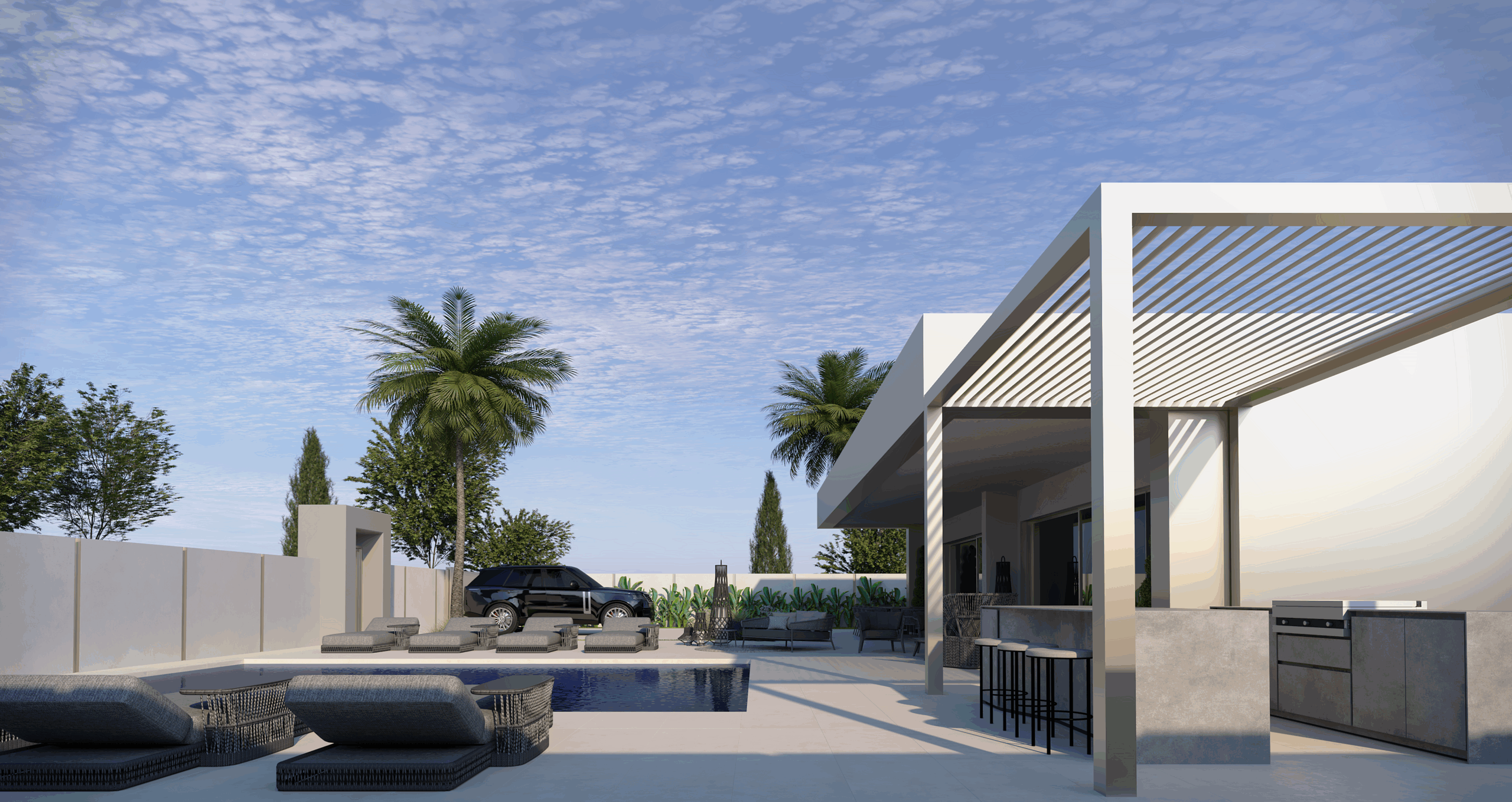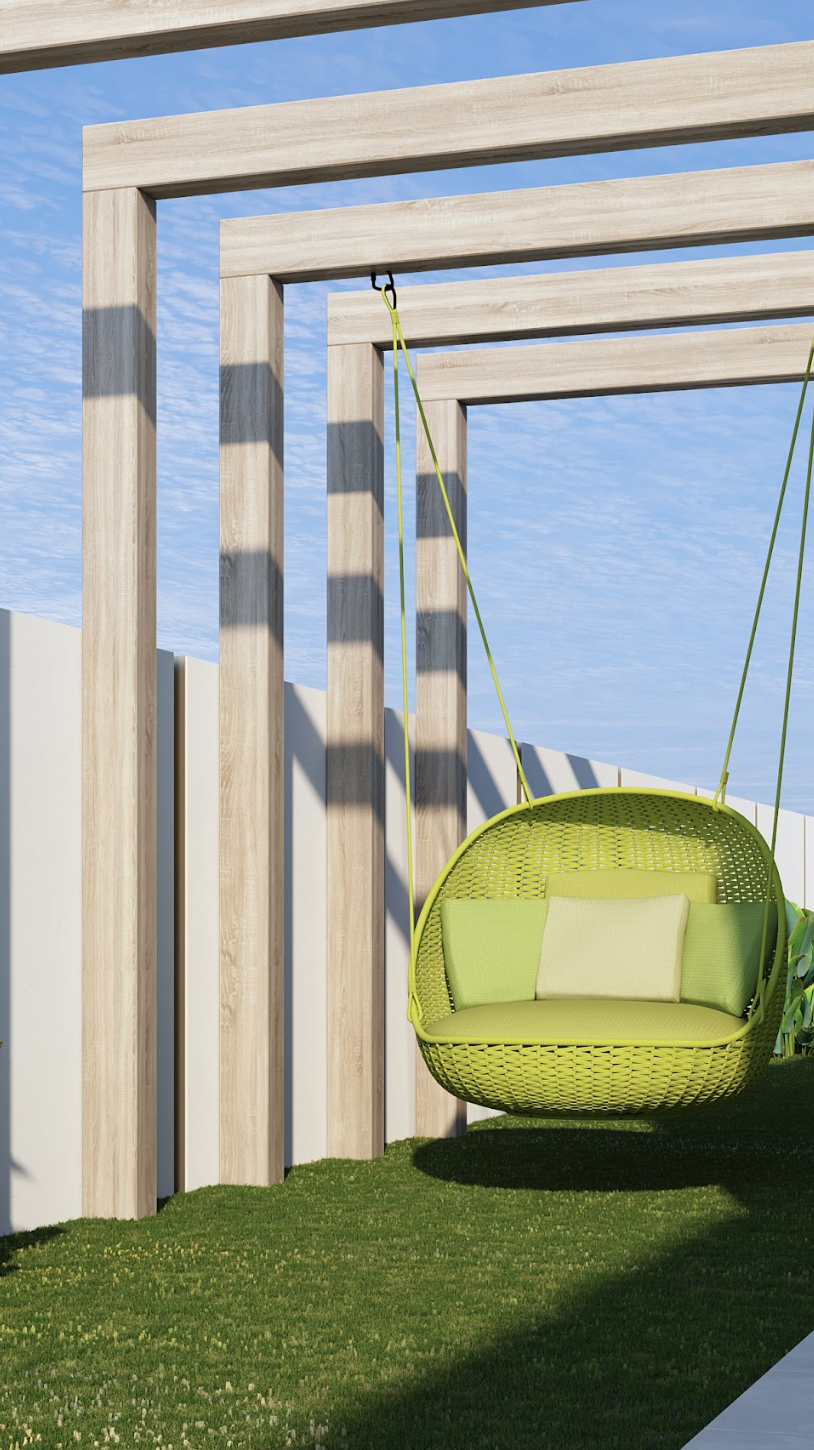 Le ampie vetrate panoramiche e i pergolati in legno favoriscono un dialogo naturale tra ambienti interni ed esterni, valorizzando la luminosità e la continuità degli spazi.